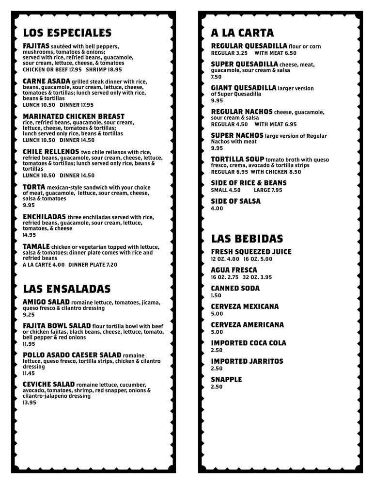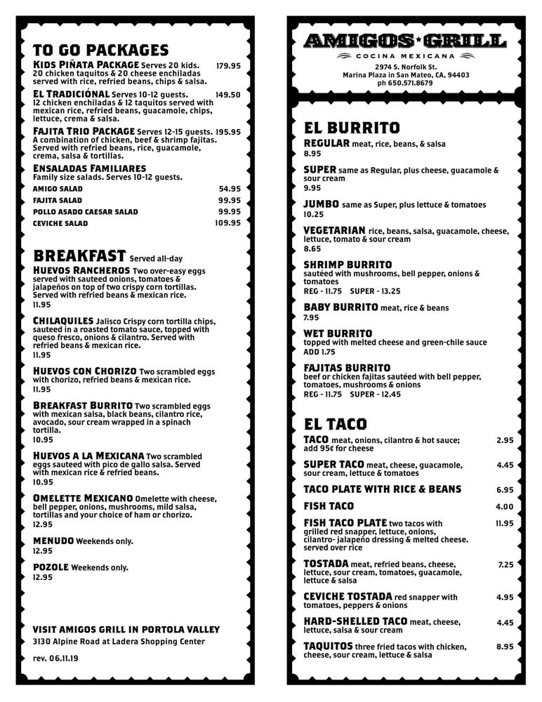 Introducing the menu at Amigos Grill Cocina Mexicana, a delightful American-Mexican eatery located in San Mateo, CA. Offering a diverse range of options, from traditional Mexican dishes to fusion creations, this restaurant caters to a wide range of palates. The menu includes a variety of vegetarian options, catering to all dietary preferences. Some highlighted dishes mentioned by patrons include the flavorful ceviche appetizer, delicious enchiladas with carne asada, and massive jumbo burritos with options like carne asada and Al Pastor. Customers appreciate the fresh and quality ingredients used in the dishes, emphasizing the authentic Mexican flavors. The casual setting, attentive service, and various amenities such as outdoor seating, catering services, and happy hour specials make dining at Amigos Grill a memorable experience for all.
